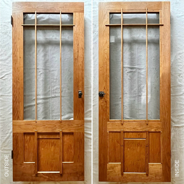 We, the architect and I, want to say we collaborated on the design, but I think his home dictated everything: match the interior wood, match the existing door and windows, make it lock, and let their low-rider corgi get in & out. Made with cherry hardwood, stained and protected with three coats of spar-urethan. Also made so you can change out the screen easily.