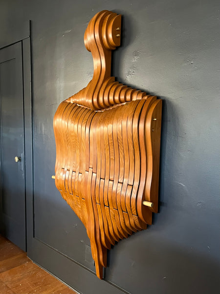 Commissioned by a poet-professor, this is The Poet’s Desk. She wanted a desk that doesn’t gather clutter, inspires the writing process, and looks like art when she’s not using it. Redwood lumber and brass. 75”h x 38”w x 6”d.